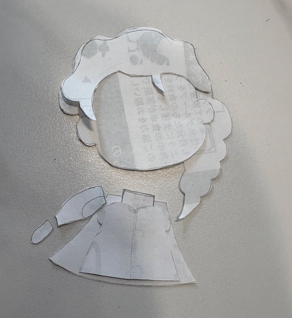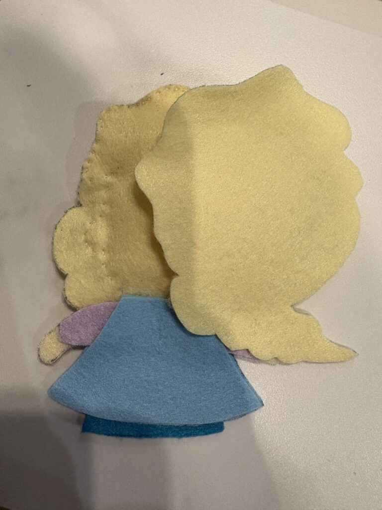 縫い付け面がみえないように、髪の毛(後面)のパーツで覆って隠しました。