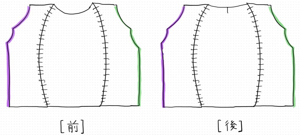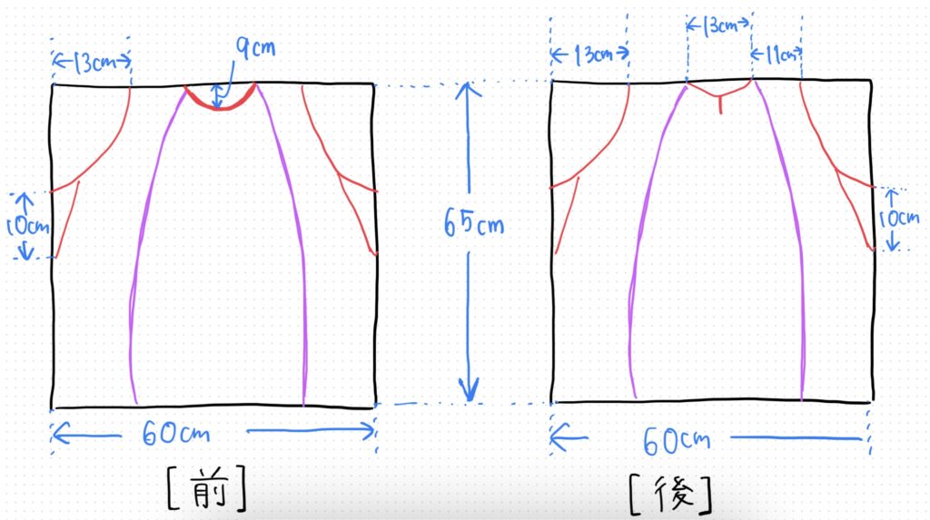 お子さんに実際に着せてみて、丈を短く切ったり、首回り、腕回りの空き具合を確認します。