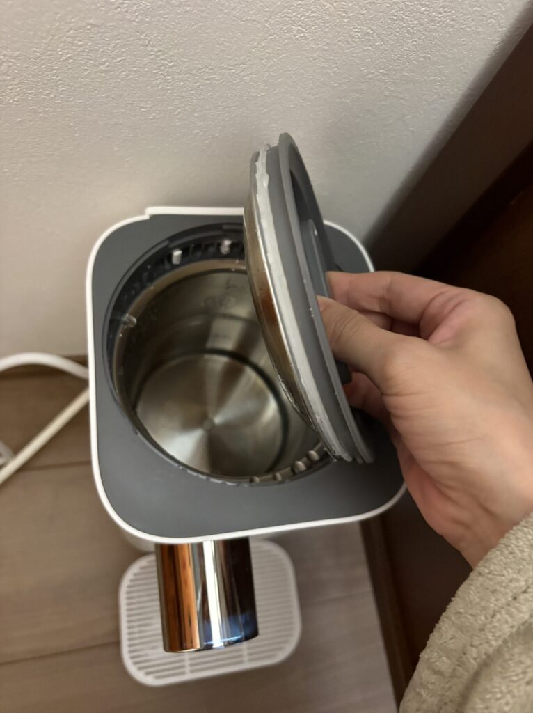 フタや後面のフィルターは簡易的な構造のため、倒れた際にお湯がこぼれる可能性があると感じました。