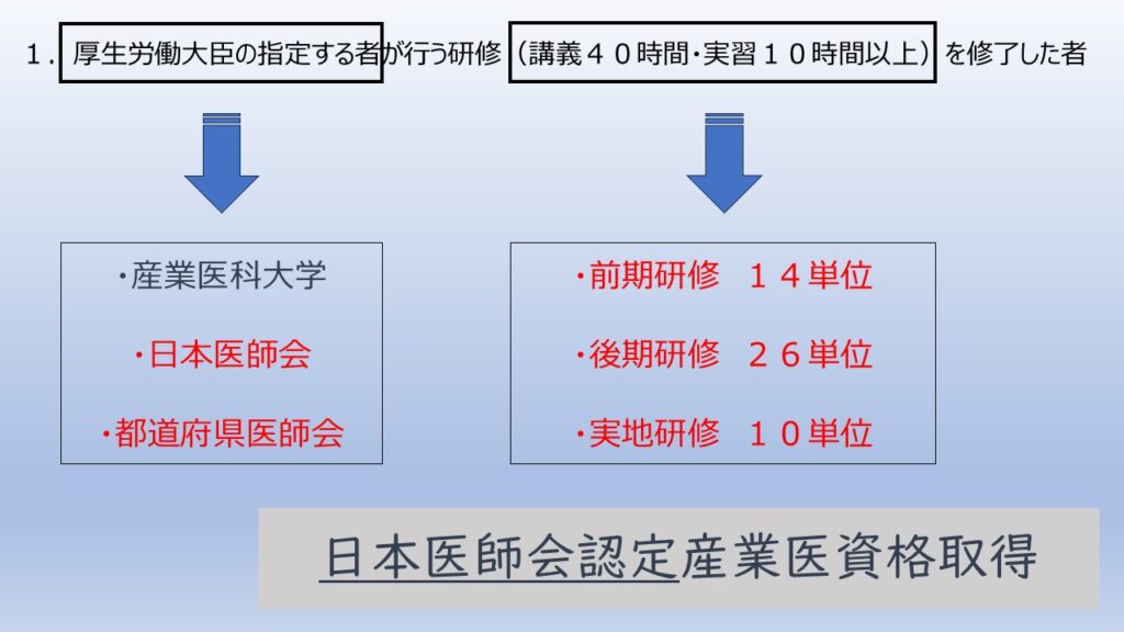 日本医師会、都道府県医師会で研修修了した者は、「日本医師会認定産業医資格」を取得することになります。